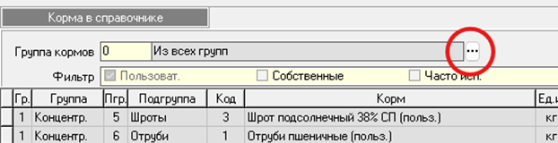 − в верхней части окна при необходимости отсортировать справочник по группе и подгруппе корма. Если кормов не много, удобнее выбрать группу «Из всех групп» и подгруппу «Из всех подгрупп», чтобы сразу видеть на экране все внесённые (доступные для расчета рациона) корма;