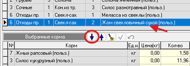 − в перечне кормов курсором выбрать корм, нужный для расчета рациона;