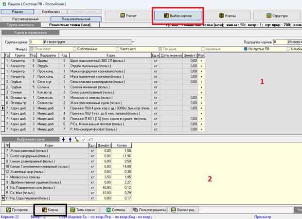 Вкладка состоит из двух частей: в верхней части (1) – справочник кормов, в нижней (2) – корма, выбранные для расчета рациона