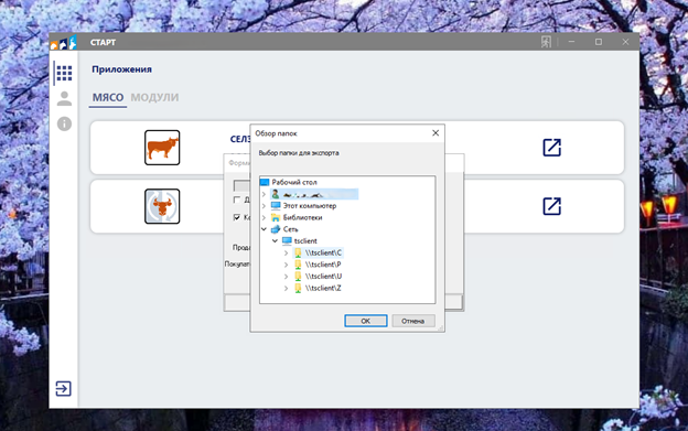 Для сохранения файлов через модуль обмена необходимо указывать путь сохранения через папку Сеть - tsclient